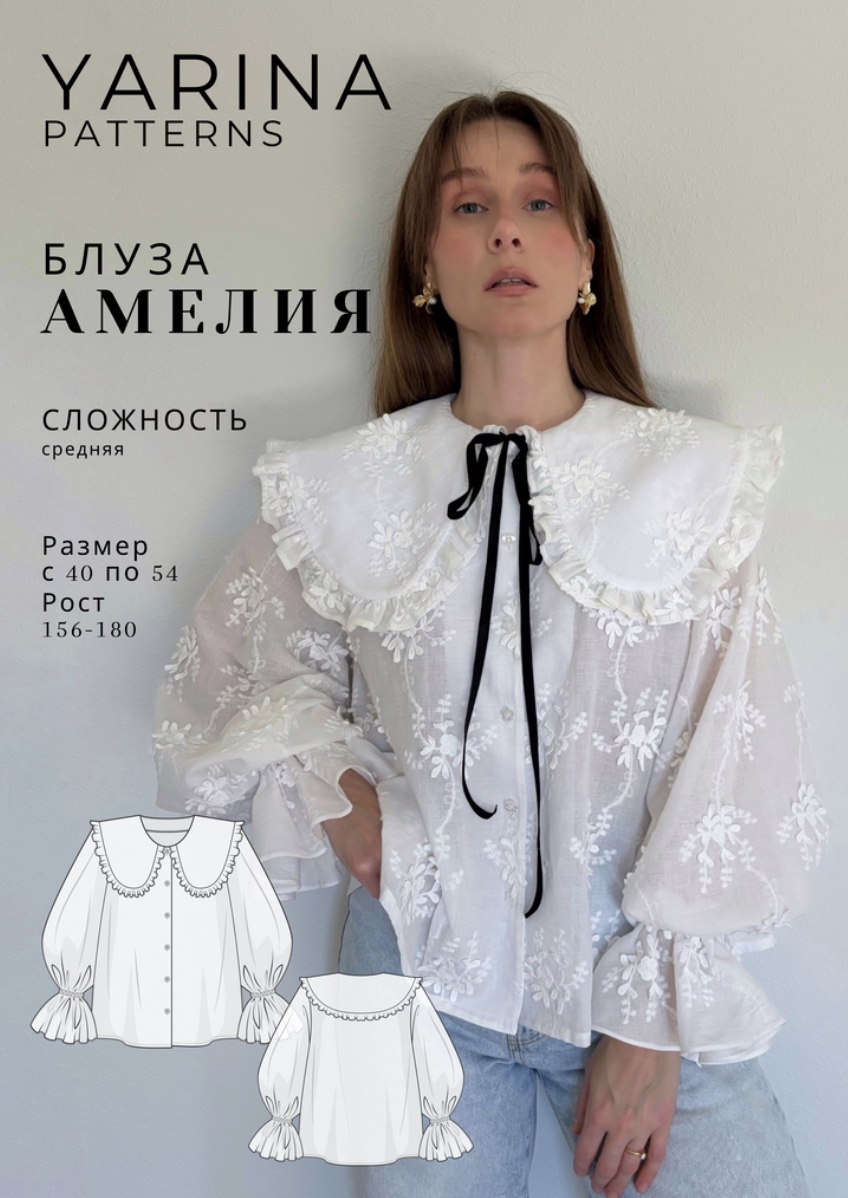Выкройка блузы “Амелия” большого объема и А-силуэта. Застежка блузки центральная по борту на обметанные петли и пуговицы. Воротник большого объёма, отложной с оборкой по краю. Рукав большого объема рубашечный, длинный. По низу рукава выполнена сборка за счёт кулиски с эластичной тесьмой. Длина блузки до линии бедер.