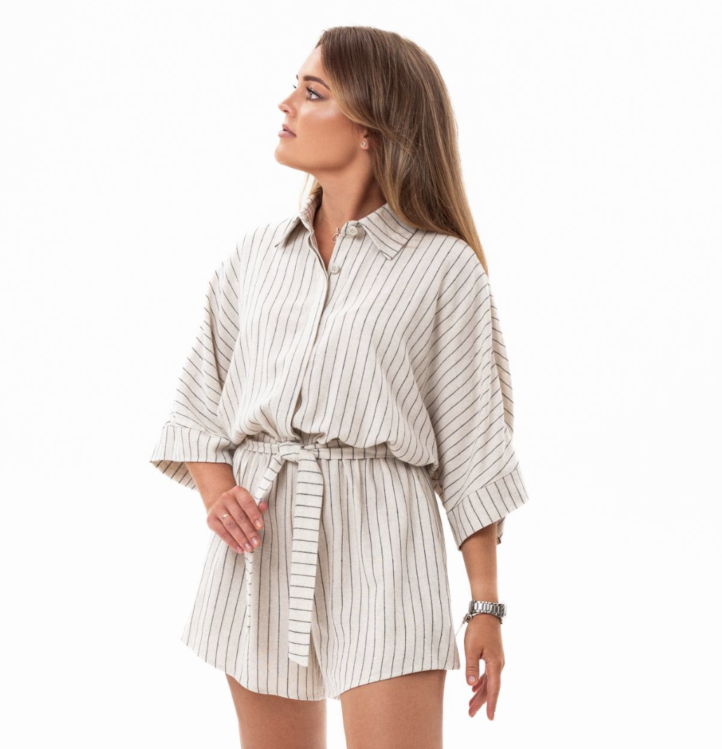 Комбинезон большого объёма, отрезной по линии талии. По центру лифа переда расположена супатная (потайная) застёжка на петли и пуговицы. Отложной воротник со стой-кой. Цельнокроеный рукав по низу обработан притачной манжетой. В нижней части комбинезона (в шортах), два кармана в боковых швах. В шов притачивания шорт к лифу вставлена эластичная резинка. Комбинезон дополнен съёмным поясом, который проде-вается в шлёвки.